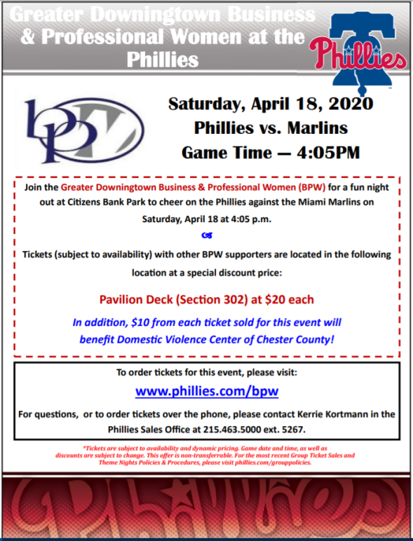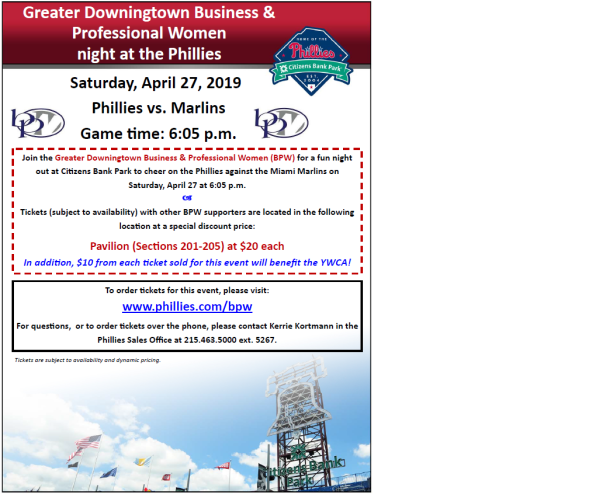 Greater Downingtown BPW will be contributing funds raised at our Phillies Night on April 27, 2019 at Citizens Bank Park to the YWCA. Tickets are on sale now at $20.00, with half the price of the ticket going to the YWCA. Visit www.phillies.com/bpw