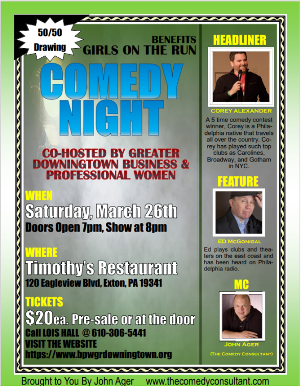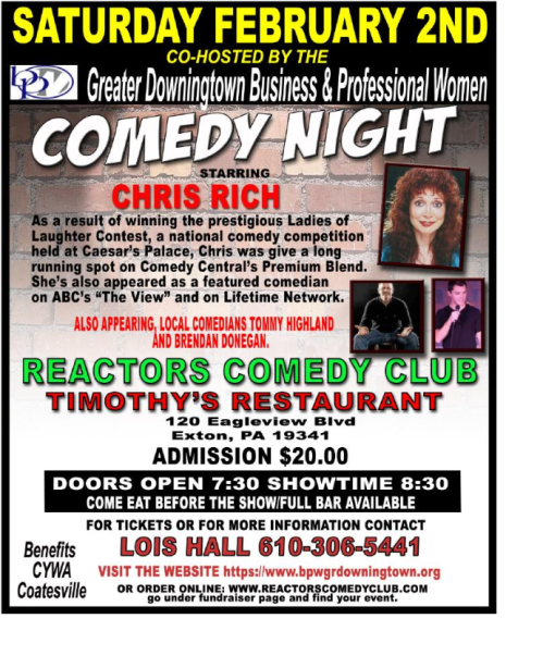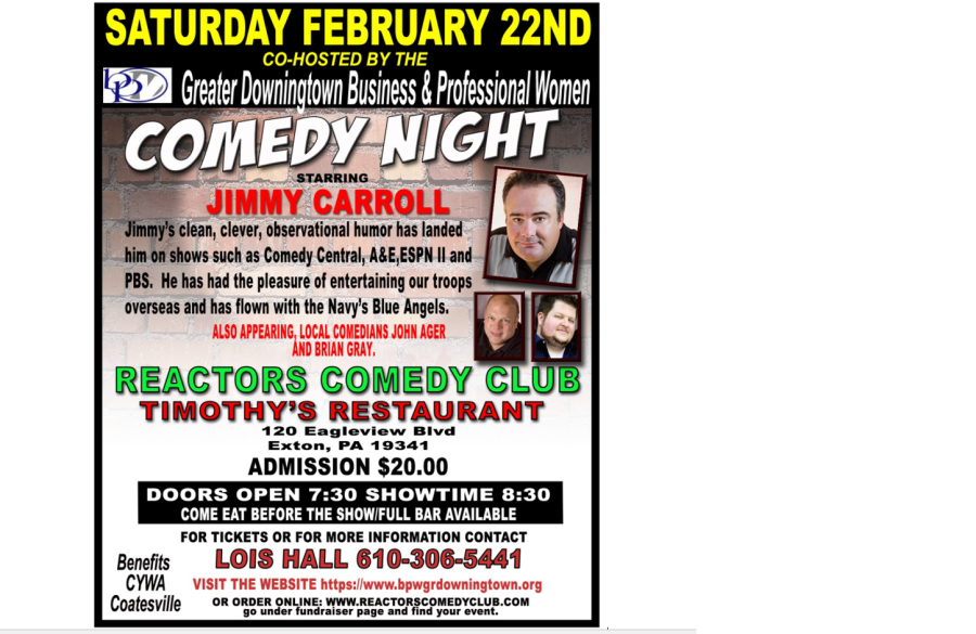 Tickets can be purchased by contacting any Greater Downingtown BPW member or online at WWW.REACTORSCOMEDYCLUB.COM scroll down to Saturday, Feb 22nd fundraiser event at Timothy's Restaurant, Exton, PA