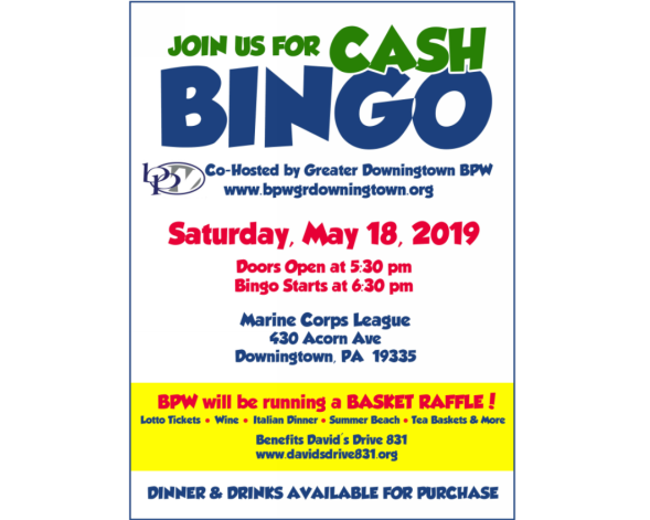 Greater Downingtown BPW’s fundraiser on 5/19/18 was a great success. The host location was the Marie Corps League’s Bingo in Downingtown, PA. The fundraiser was for David’s Drive 831, an organization that helps the homeless and hospitalized veterans. Along with the bingo, Greater Downingtown members created baskets to raffle as part of the fundraiser.