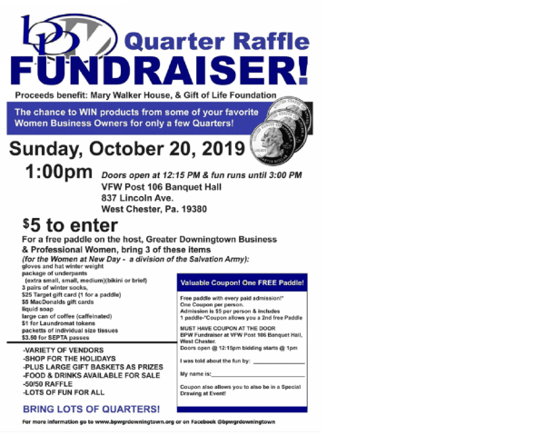 Greater Downingtown BPW’s Quarter Raffle fundraiser on 10/21/18 was a great success. The host location was the VFW Post 106 Banquet Hall in West Chester, PA. The fundraiser was for Mary Walker House and Gift of Life Foundation. Greater Downingtown members created beautiful baskets to raffle as part of the fundraiser and special vendors participated in the Quarter Raffle.