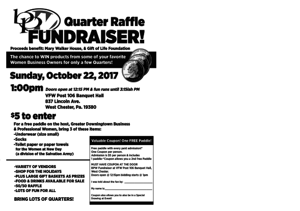 On Sunday, October 23, 2016, we enjoyed a fun and successful Quarter Raffle that was held at VFW 106 in West Chester from 1pm to 3pm.